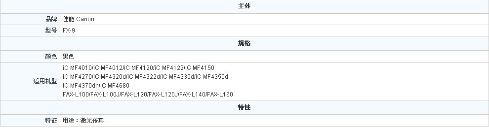 产品报价:415元,佳能(Canon)FX-9 黑色硒鼓(适用L100 MF4120 4010),5%覆盖率打印量A4 2000页!