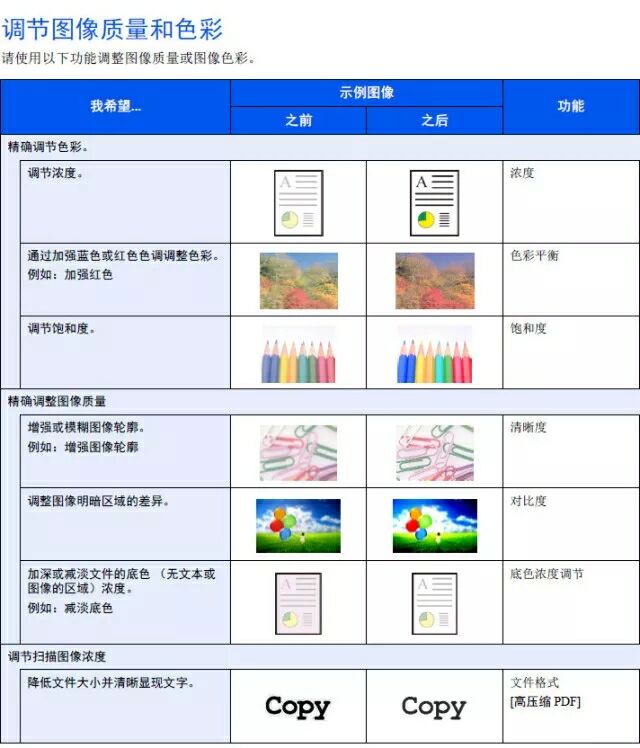 首先我们来看看复印机的“色彩/图像质量”→ “调节图像质量和色彩”的内容