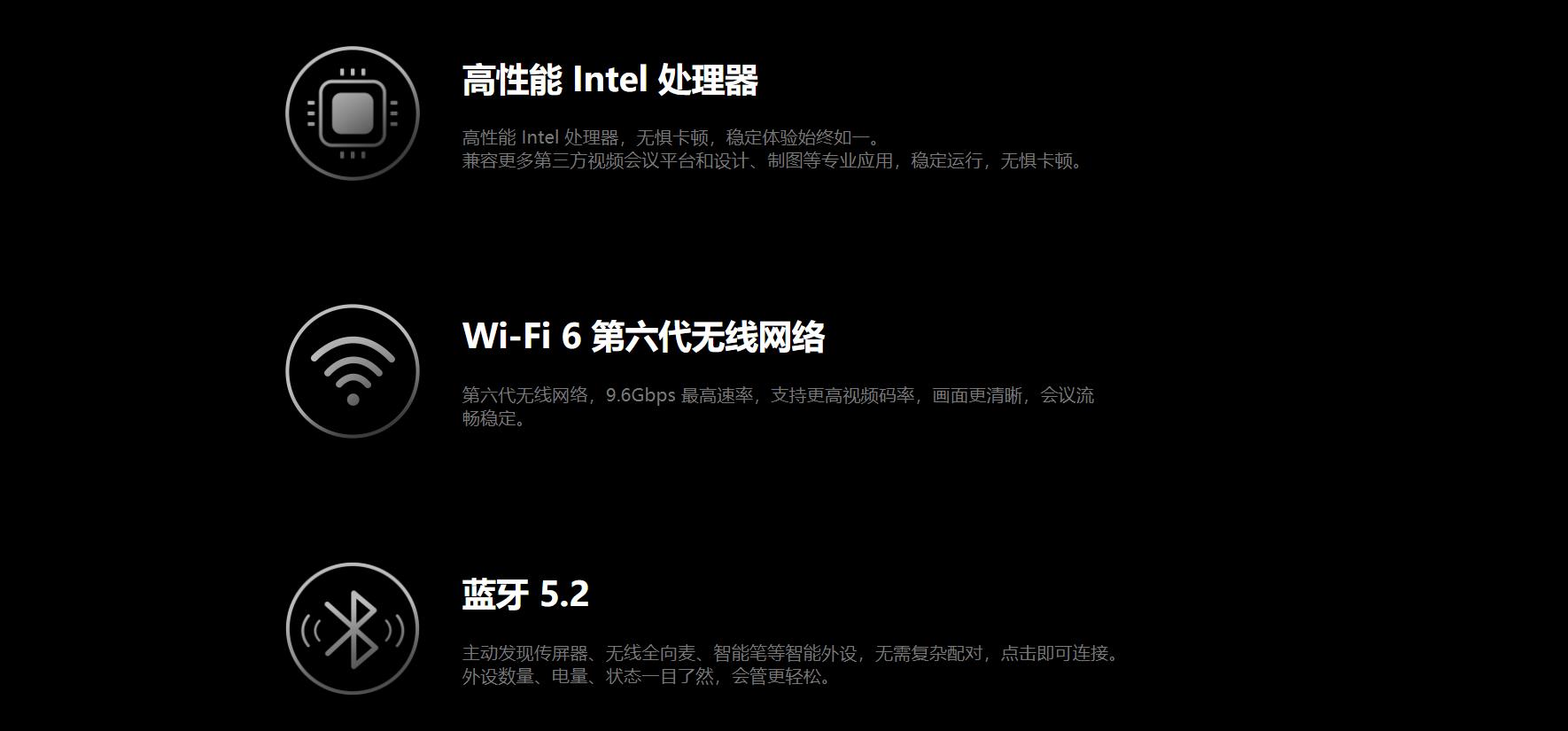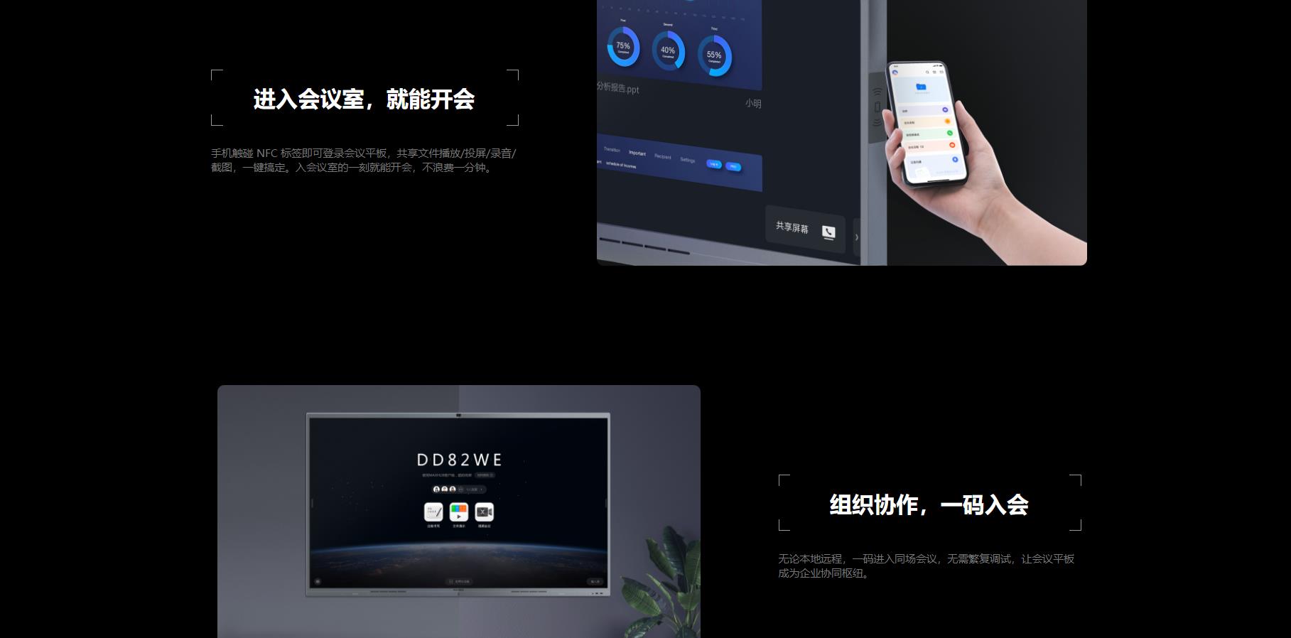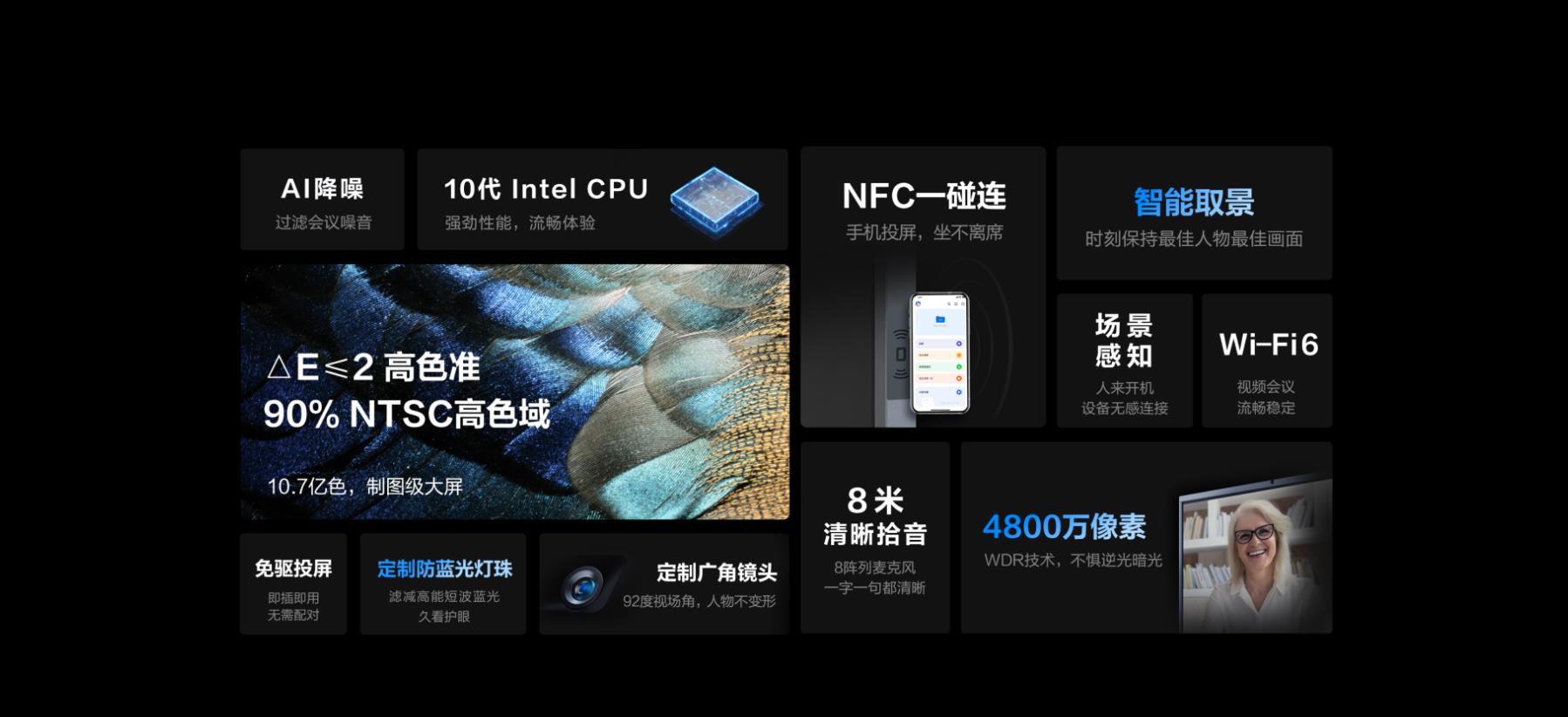 * 一键连接:电脑、手机、平板可通过 MAXHUB 客户端连接 MAXHUB,PC 端支持 Windows 7、macOS 10.10 及以上,手机、平板传屏支持 Android 9.0 及以上操作系统,iOS 端将在后续升级支持。 * NFC 连接:需要手机支持NFC功能,并安装 MAXHUB 客户端。无线投屏。 * 无线投屏:电脑、手机、平板可一键投屏,PC 端支持Windows 7、macOS10.10 及以上,手机、平板传屏支持 Android 5.0、 iOS 9.0 及以上操作系统。电脑可通过连接 MAXHUB 无线传屏器投屏。 * 反向触控:电脑通过无线投屏与 MAXHUB 会议平板连接过程中, 电脑屏幕画面被投影到 MAXHUB 设备上, 在 MAXHUB 会议平板上可以直接触控操作电脑,而无需单独在电脑上本地操作。 * 低书写高度:从屏幕到识别物体(手指、红外书写笔或其他遮挡红外光线物体)的最低距离为 1.5mm 。 * 0贴合:玻璃和显示屏之间的距离为0.8mm,减少空气折射,降低视差,提升显示效果; * 感光面积提升 25%:对比上一代 MAXHUB 经典版。 * 视野扩大 37.3%:对比上一代 MAXHUB 经典版。 * 定位声源:在识别范围内(会议平板正前方180°,8范围内),MAXHUB 会议平板可根据主讲人的讲话语音采集,确认主讲人所在会议室中的位置方向。 * 8米远距拾音:在人正常说话,周边环境音为 40~50db 情况下,由 MAXHUB 实验室内部测试所得结果。 * 屏幕共享:支持通过软件将设备桌面内容共享给所有参会人,该功能须在联网状态下方可使用。 * 兼容第三方会议应用:指支持 PC 端安装的第三方会议应用。