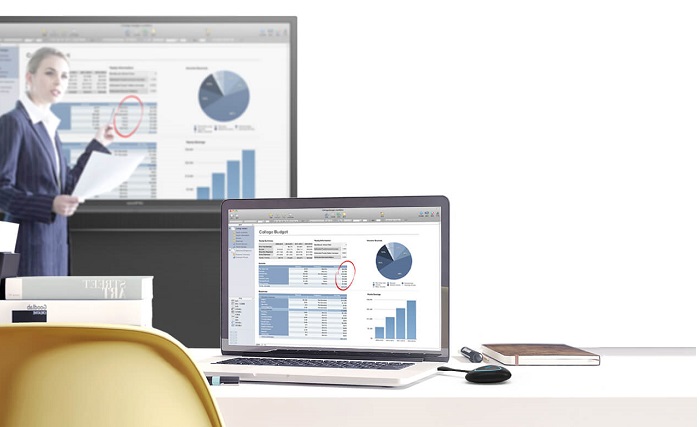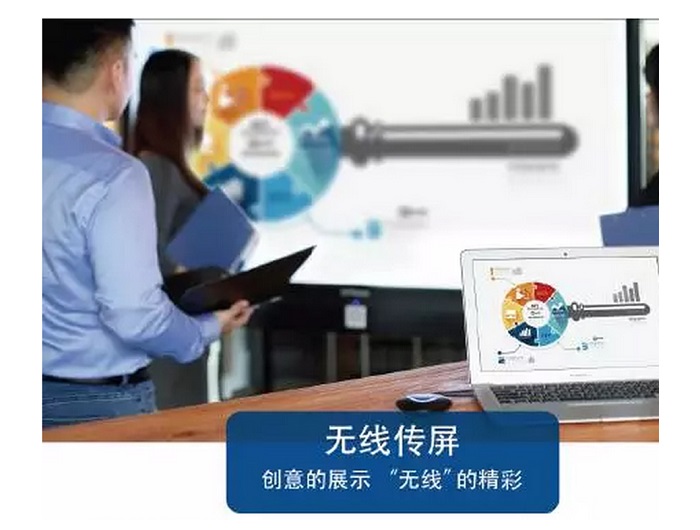 与会者不再需要通过数据线进行投影,通过传屏配件即可实现无线投屏,并且能做到全设备兼容,无论使用智能手机、平板或者电脑,可将PowerPoint等文件一键无线传输到会议通上。