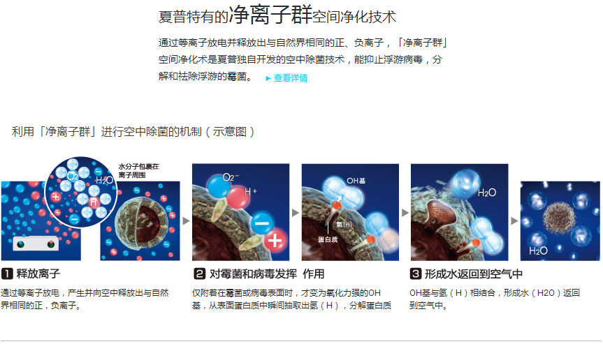 以搭载净离子群空间净化技术的消毒机KC-W380SW-W和FU-A420S系列空气净化器为例:与一般单独依靠过滤网过滤空气的方式不同,夏普空气消毒机采用“攻防一体”的形式杀灭或抑制空气中的细菌。所谓“攻”指的就是夏普独自开发的“净离子群”空间净化技术,通过将空气中的水分子直接电离成H(氢离子)和O2(氧离子),同时被水分子包裹、形成净离子群(离子簇)。这些净离子群在接触有害物质的瞬间,即会生成氧化性极强的OH根离子并从有害物质中夺取H+(OH根离子和H+形成水分子,重新回到空气中),对室内空气中的有害物质具有极强的杀灭能力,从而达到抑制自然菌等有害物质的作用,夏普空气消毒机在一定条件下可以有效除去空气中99.98%的白色葡萄球菌、99%的甲醛、对室内空气中自然菌的平均消除率为96.79%,实现了高效除菌。另外,夏普空气消毒机(KC-W380SW-W)获得了中华人民共和国卫生部颁发的“消毒器械卫生许可批件(卫消字(2011)第003号),再一次证明了夏普空气消毒机的净化、消毒的高品质。而FU-A 420S 系列设计时尚美观,甚至有大胆前卫的黑色设计。