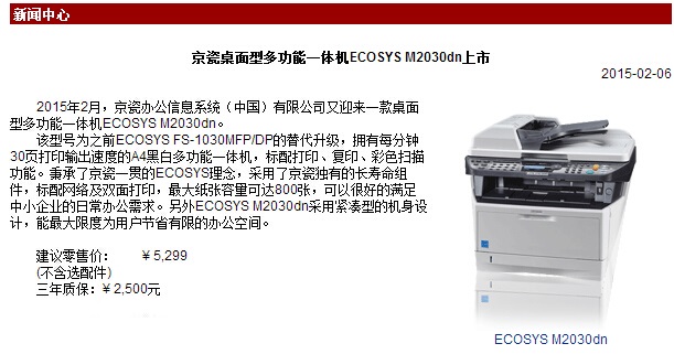 京瓷桌面型多功能一体机ECOSYS M2030dn上市