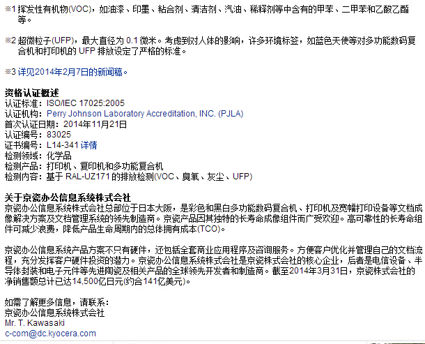 京瓷办公信息系统研发中心检测设施荣获化学排放检测国际标准ISO/
