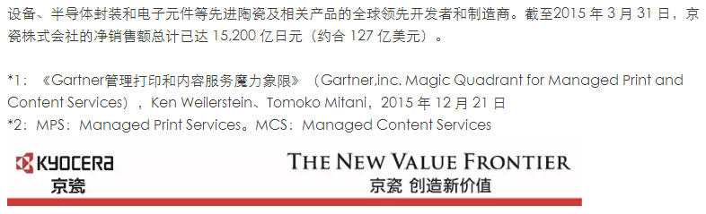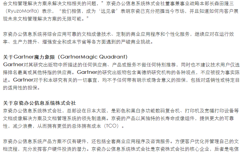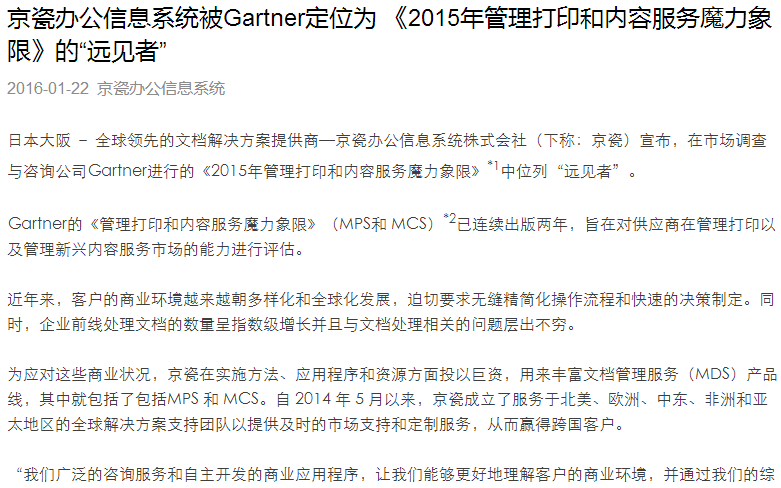 京瓷办公信息系统被Gartner定位为 《2015年管理打印和内容服务魔