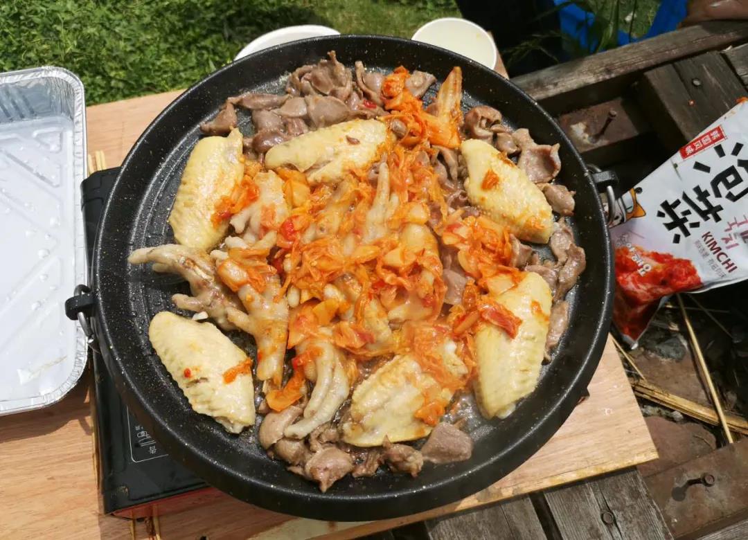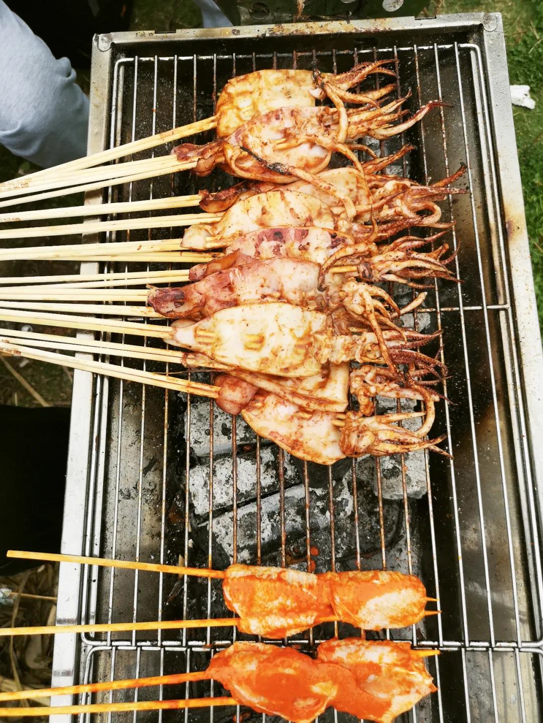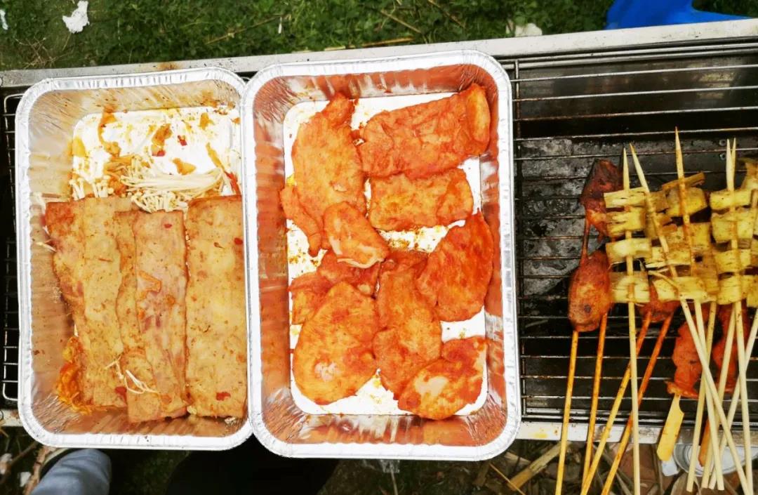 围坐在烤炉边串肉、涮油、撒料、翻面